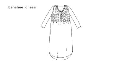 Banshee dress är en långärmad klänning i mjuk jersey. Den har smock med en liten v-ringning i överdelen och släpper över magen. Fuskknäppning fram och dolda fickor i sidorna. Lite längre bak än fram. En älva är broderad på ena ärmen.