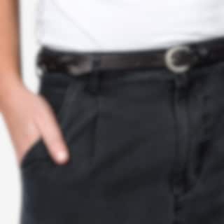 Byxan har gylf och hällor, snedställda fickor fram och ett par gubbveck. Den har effektfulla sömmar på insidan av byxbenen vilka sitter löst över låren men som smalnar av mer och mer nedanför knäet och över vaden. Vi tycker att Fisherman pants skall vara lite skönt nedhasade och kan därför rekommendera att man hellre går upp än ner en storlek. Modellen på bilden är 172 cm lång och har storlek S. Byxorna kommer att få en mer vintage look efter tvätt.