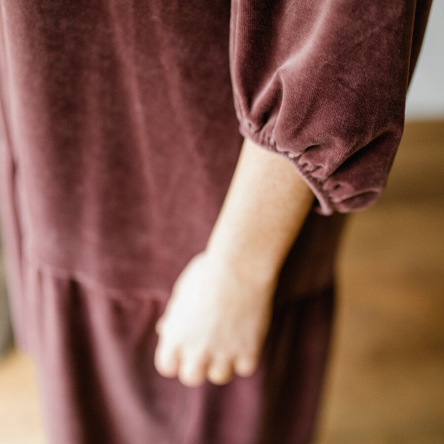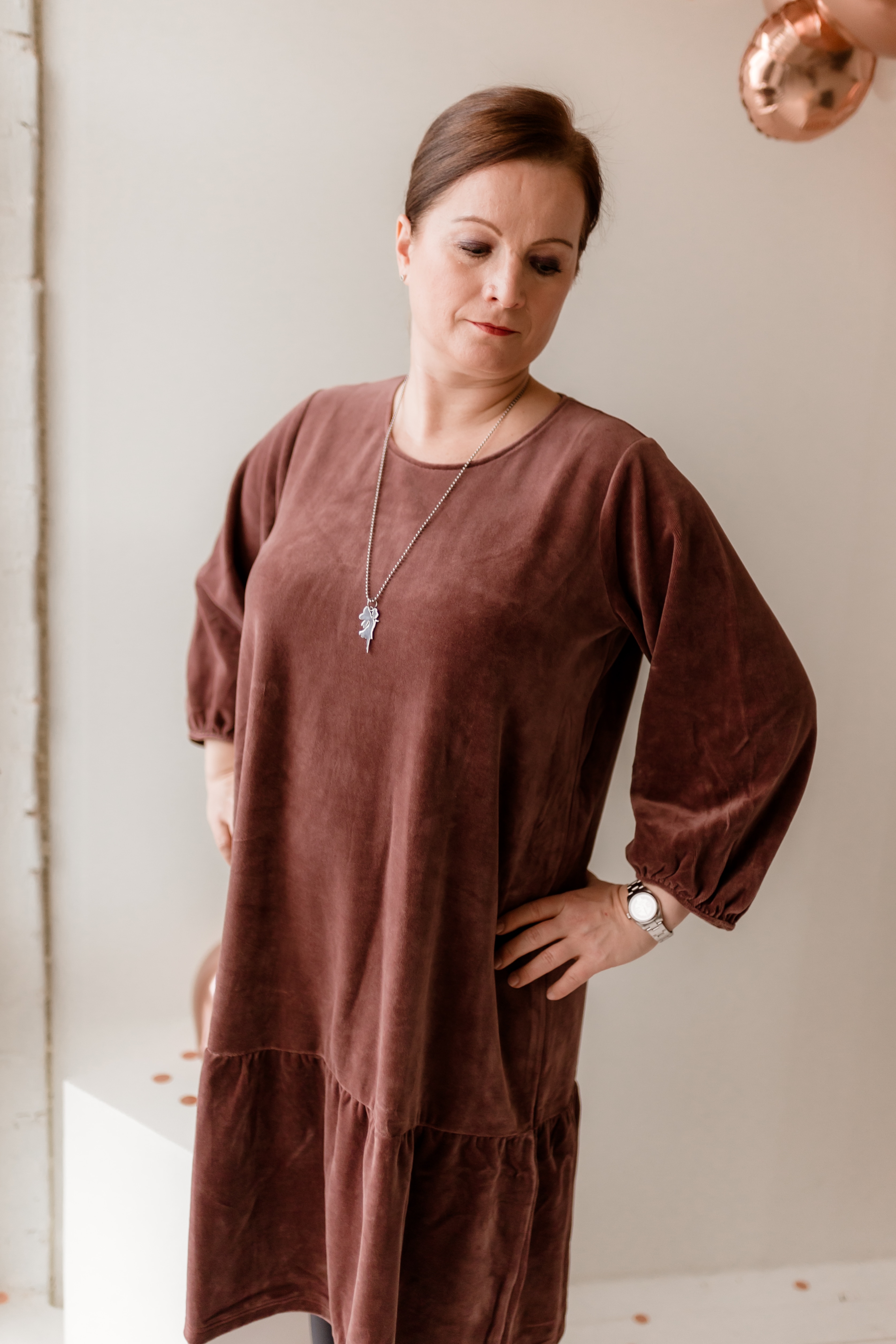 Vivid velour dress är en rundhalsad klänning i skön jerseyvelour. Klänningen har lös passform. Ärmarna är 3/4 långa med en resår i ärmslutet som gör att de blusar sig. Längst ner på klänningen sitter en volang. En berlock sitter i ena sidsömmen. Modellen är 175 cm lång och bär storlek M.