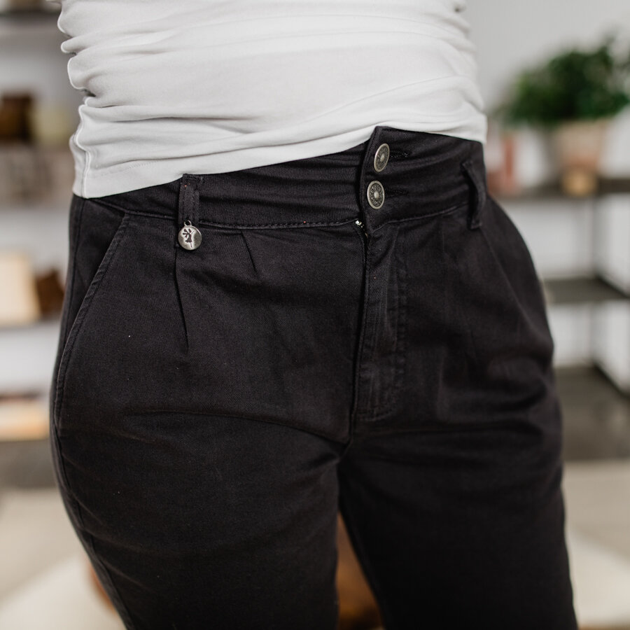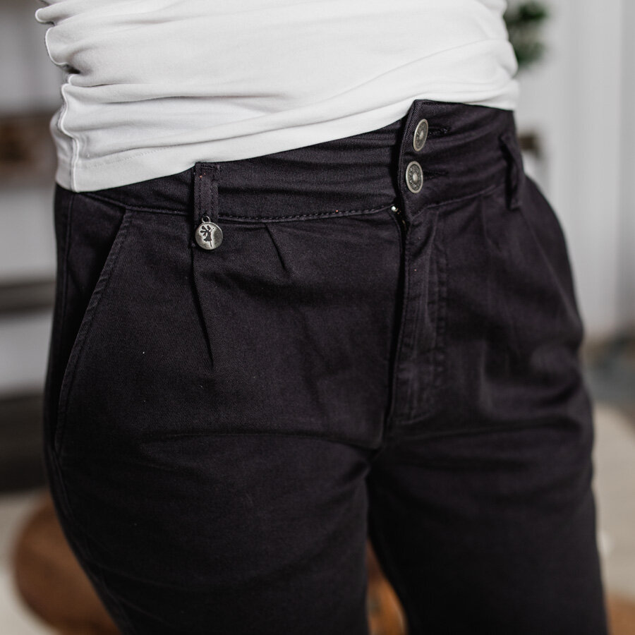 Heidi pants är ett par byxor i mjuk twill. Byxan har hög midja med chinosfickor och lagda veck framtill. Byxorna har hällor, knapp, dragkedja samt fuskfickor baktill. Något avsmalnande ben. En berlock sitter i ena hällan framtill. Twill - 97% bomull, 3% elastan Modellen på första bilden är 175 cm lång och bär storlek S.