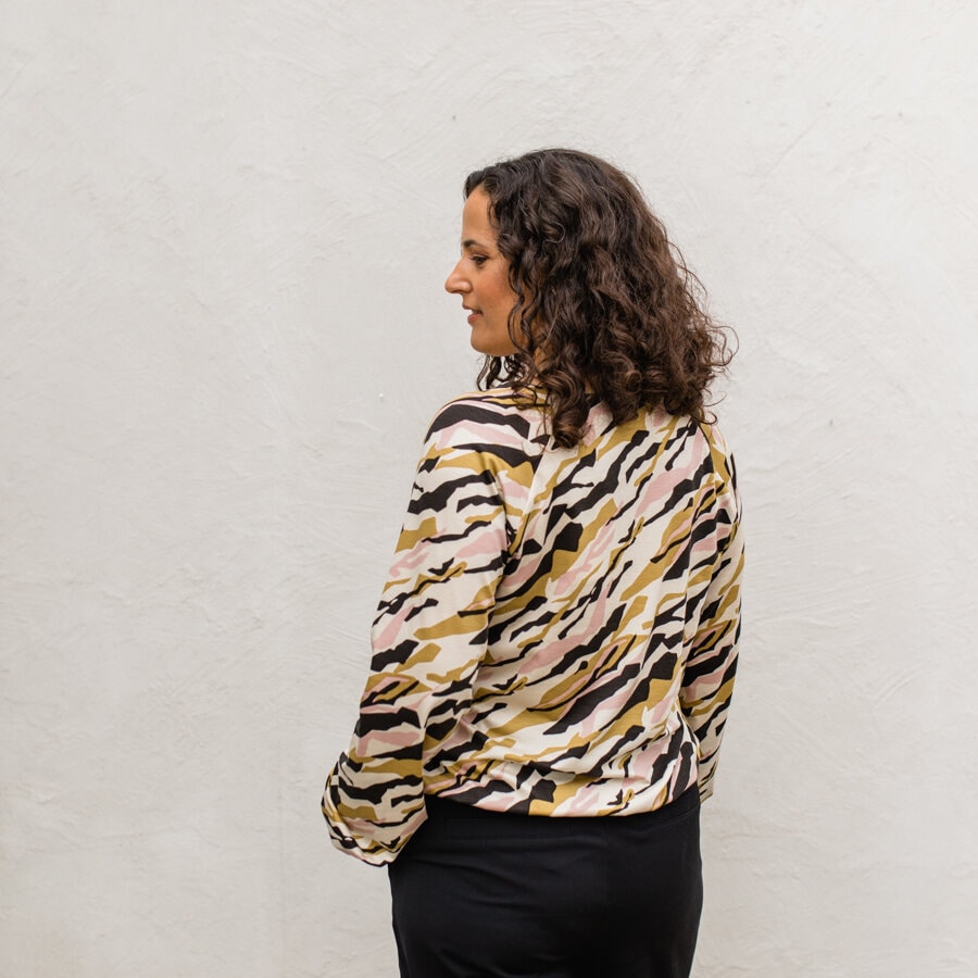 Belle blouse är en blus gjord i mjuk jersey. V-ringad med ett motveck framtill. Den har en hellång raglanärm som avslutas med en liten kant. Även nertill har den en liten kant som gör den blusig. En älva är broderad nere på vänster framsida. Modellen är 161 cm lång och bär storlek XS.